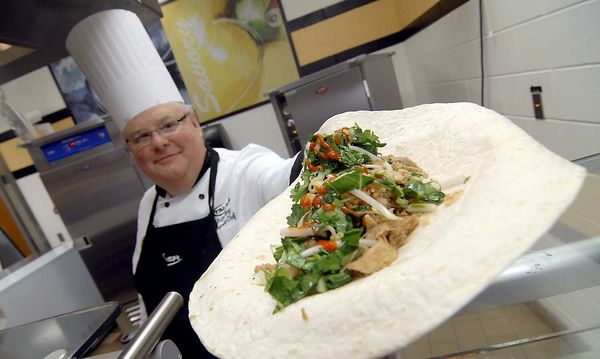 Corporate Chef Brian Renz, of Minneapolis, visited the Senior High kitchen where he created Korean cuisine with pork, kimchi and red sticky rice served together in a soft tortilla shell during a “chef on display” day in the serving line.