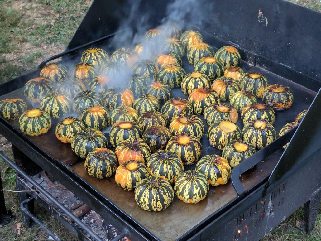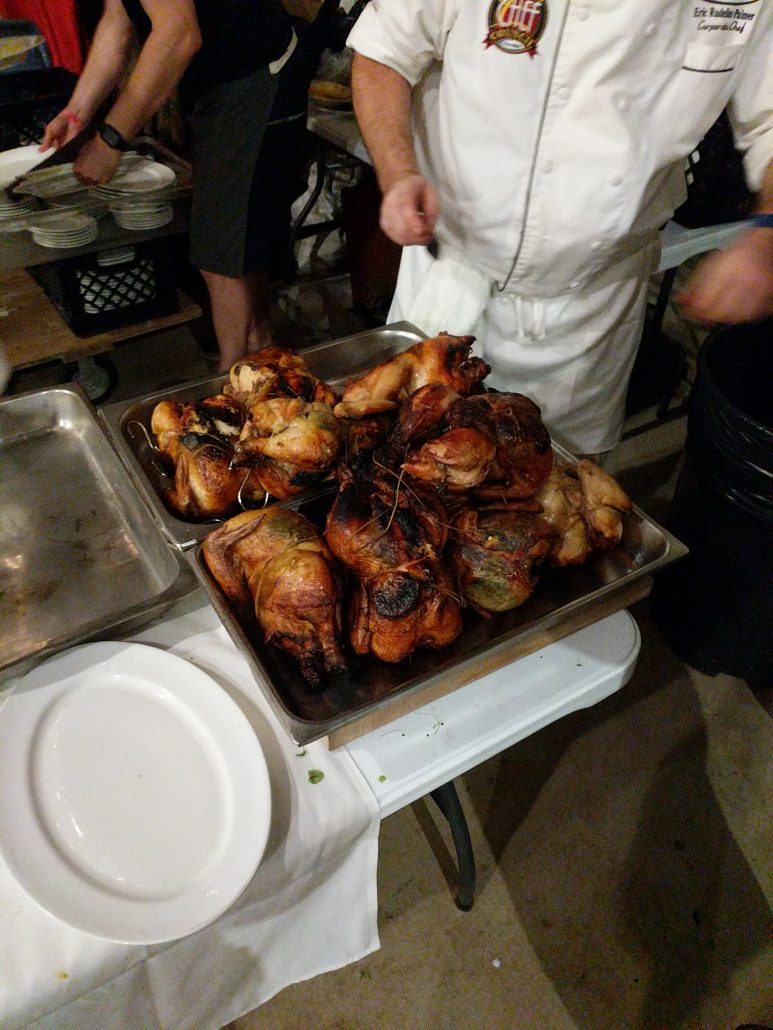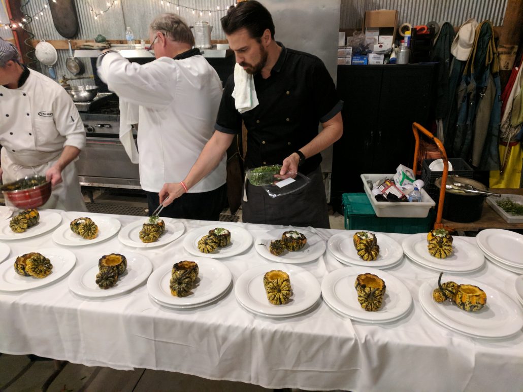 After the first three dishes, time for the main course. Chef Matt Quist and Shawn Taher carried in the beautiful roasted chicken through the barn and began readying the chicken for dinner and assembled the main course. Open fire chicken, drenched in sage butter, and Carnival squash stuffed with braised swiss chard and topped with fresh ricotta and microgreens.