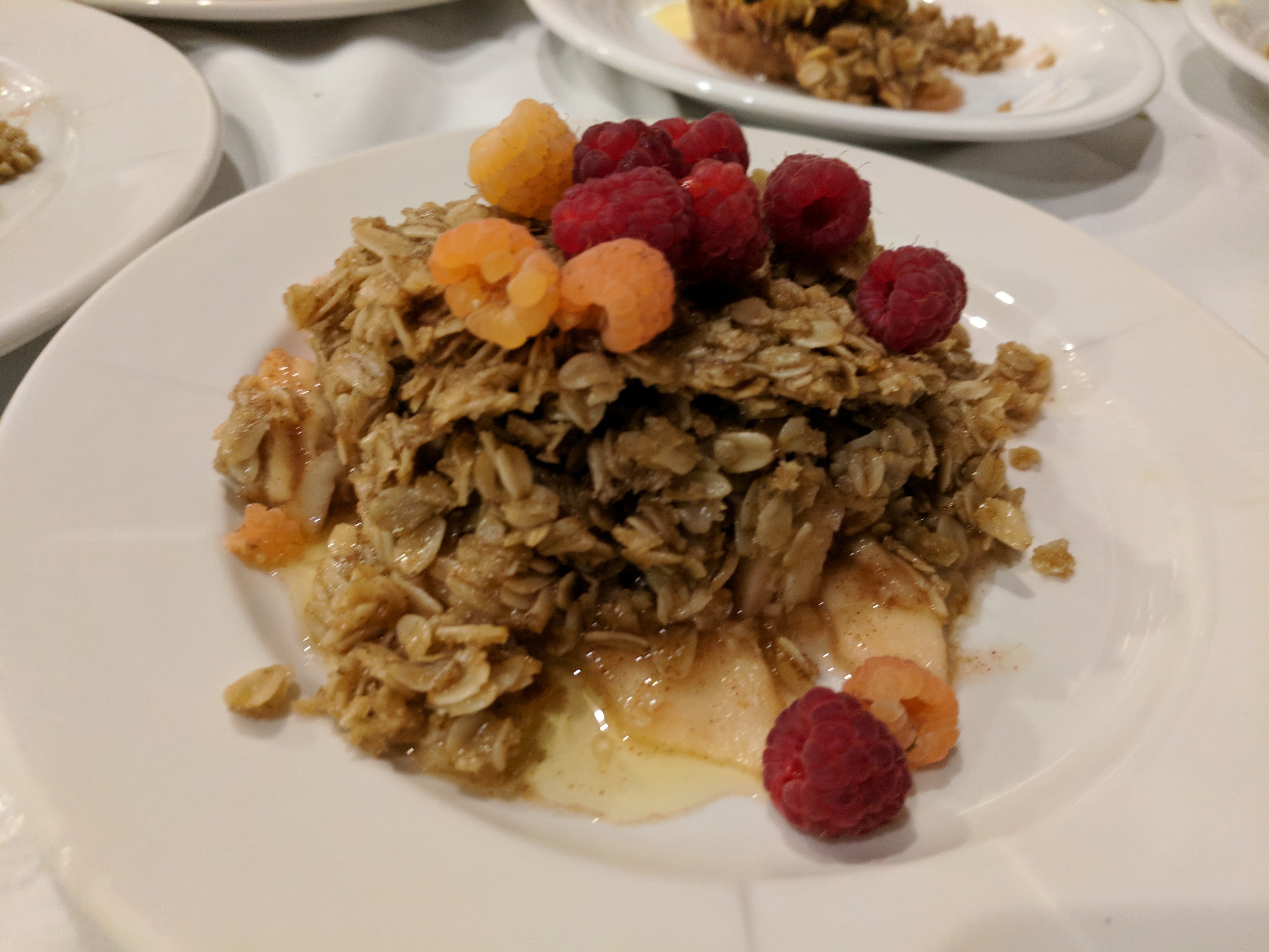 The final dish, dessert, was a beautiful fall apple crisp using fresh apples and raspberries from Earth Song Farm, Crystal Ball Farm, and Demulling Farms. It was a sweet bookend to a delicious dinner.